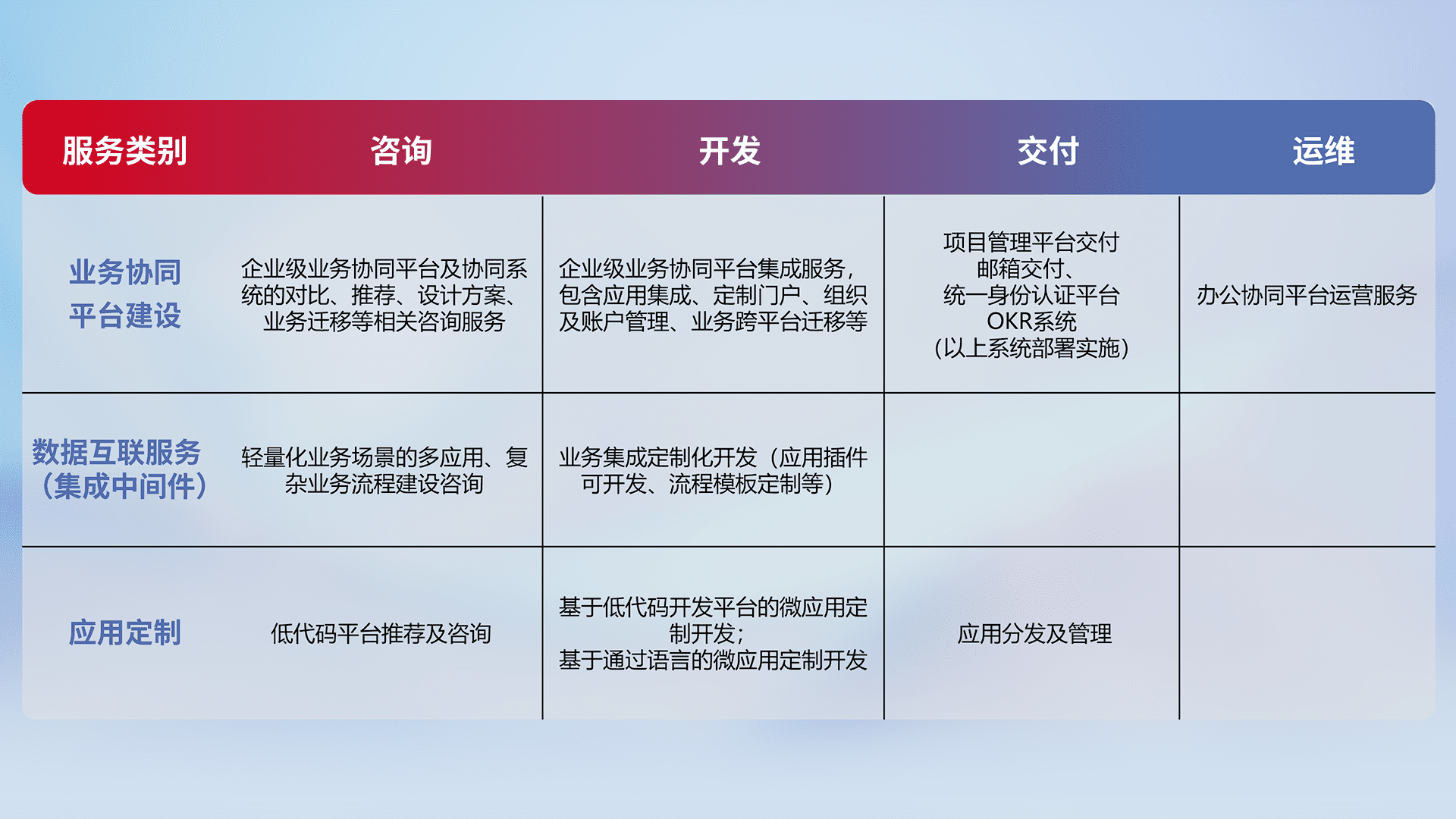 针对钉钉、、、企微、、IDaas等平台级产品提供产品的规划、、、、方案、、、、交付、、定制化开发等服务,,实现如统一协同办公、、智能客户服务、、、、混合会议管理、、智能数据查询、、等业务场景,,实现数字化转型。。。。