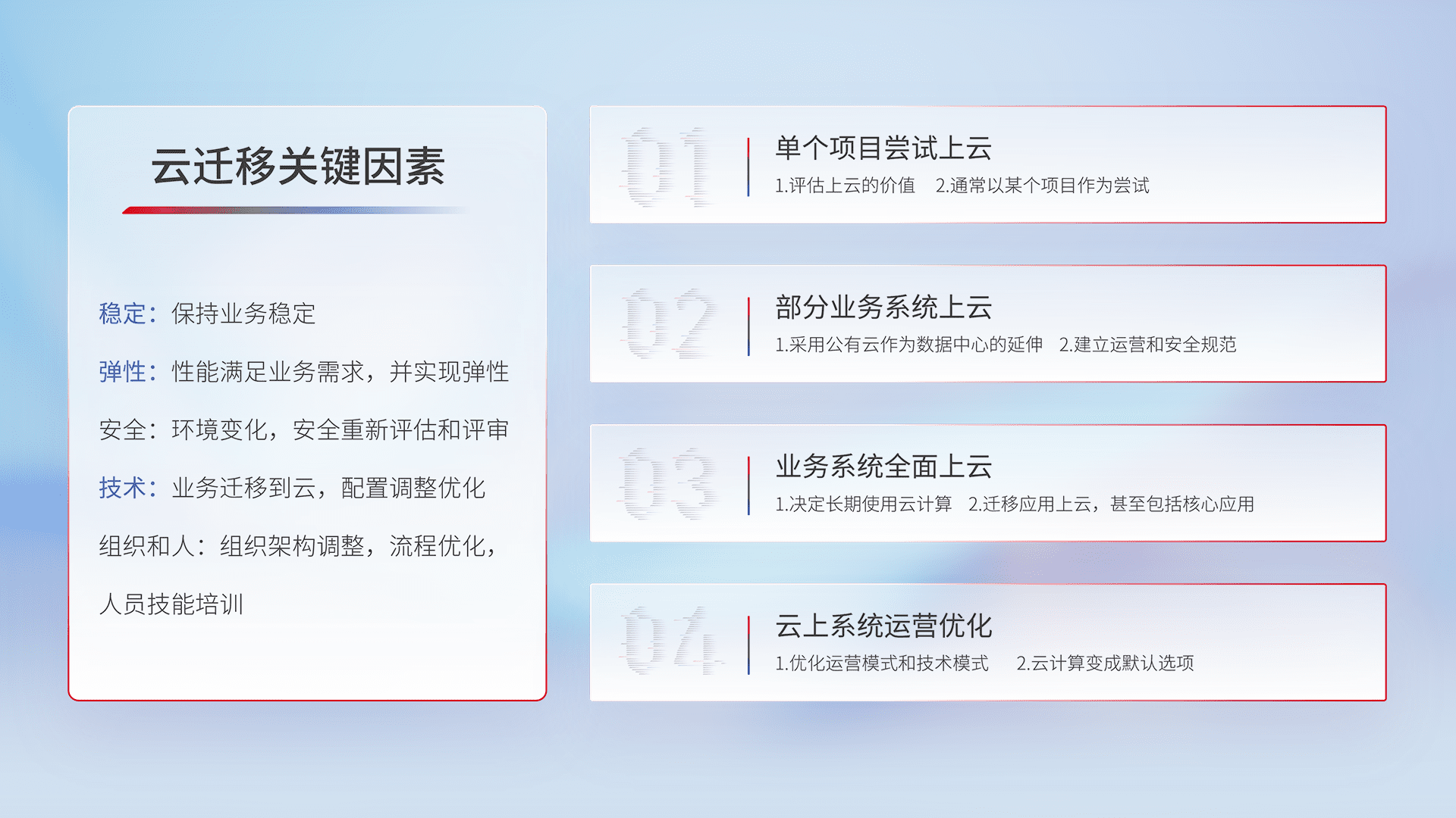结合实际业务,,从规划设计、、、云平台选型、、云原生改造、、数据迁移、、、、集成交付,,迁移全过程为客户识别最佳上云路径,,,,做好风险识别管理,,设计网络架构、、、身份权限、、、、安全审计合规、、、操作审计、、、日志审计、、、监控告警策略、、、、多站点容灾设计等,,对云上基础设施进行整体规划,,,提升IT治理水平,,以满足弹性、、、高可用、、、、高性能的需求。。。。