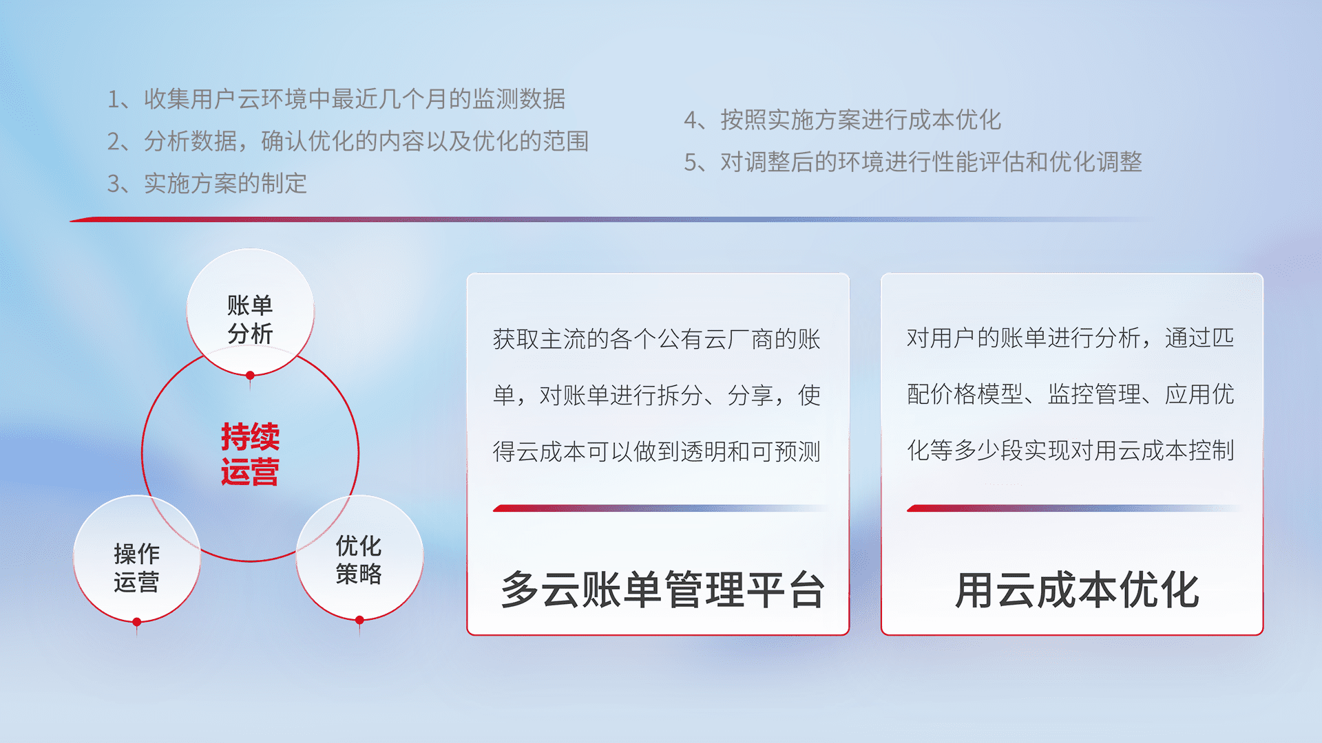 通过多云纳管,,,以统一的资源数据模型把客户的云资源进行抽象和封装,,,,进而实现对多云资源的统一操作,,,保障云资源管理的可靠性、、、、稳定性与可用性。。量身定制化运维内容,,,,配置、、、开发运维、、、、补丁管理、、、备份、、监控、、、认证和访问管理、、审计和日常巡检等,,,保障在用云过程中的可靠度,,,稳定度以及高可用率。。。
