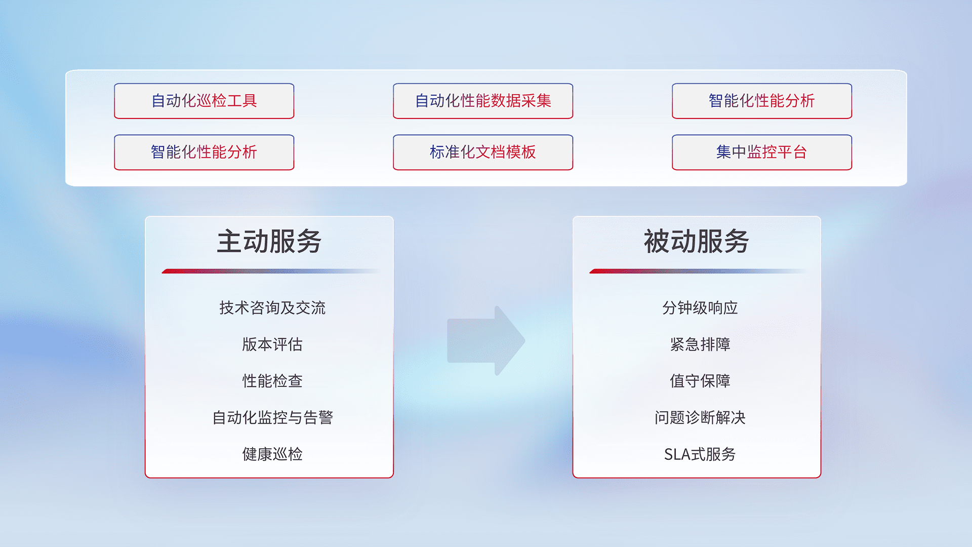 智能化工具和标准化文档,,保障服务质量,,,,提供主动服务(包含技术咨询、、、版本评估、、、性能检查、、自动化监控与告警、、健康巡检)和被动服务包含(分钟级响应、、紧急排障、、、、值守保障、、、、问题诊断解决、、、SLA服务)。。。